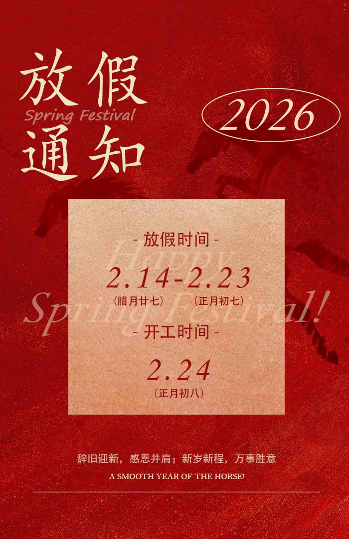 根据公司安排,2026年02月14日(腊月廿七)— 2026年02月23日(正月初七),共计休假10天;假期结束后正常返岗, 2026年02月28日(正月十二)正常上班。